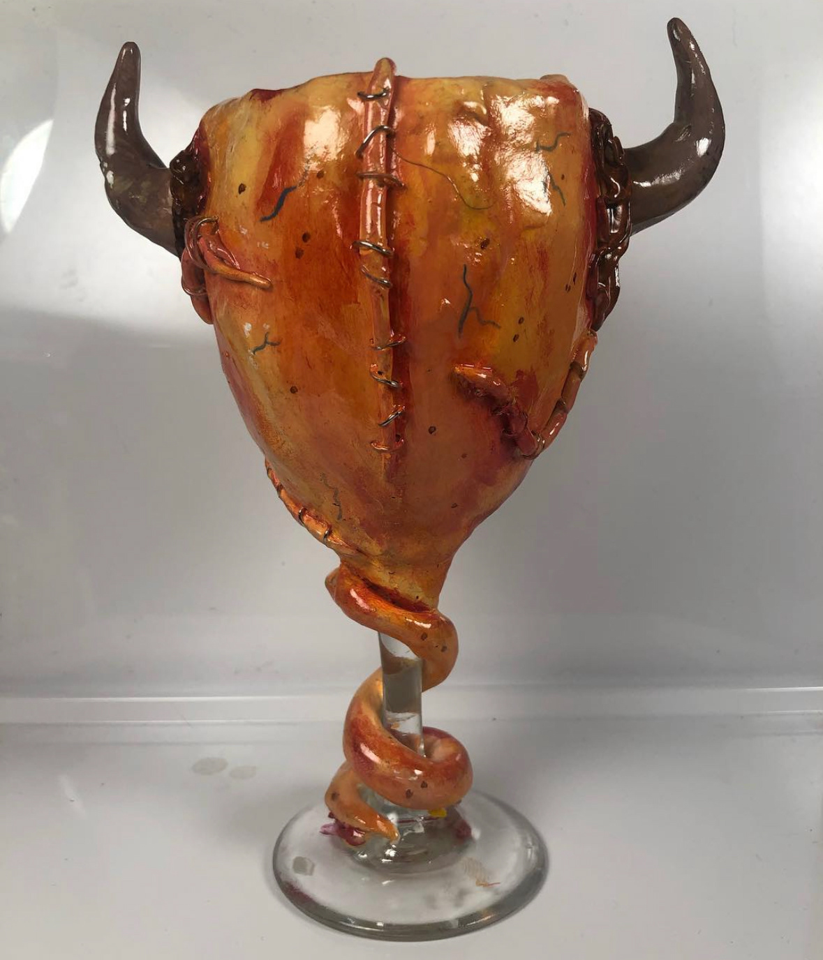 Polymer clay, acrylic paint, resin sculpted around class cupĀ