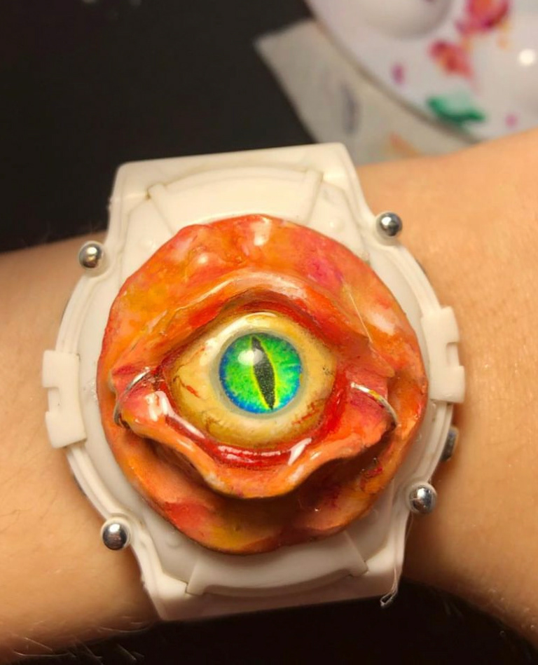 Polymer clay, acrylic paint, resin added to plastic watch shell.